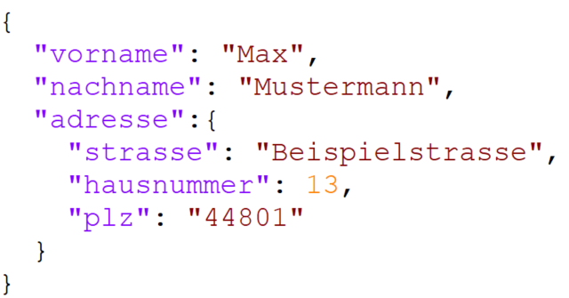 Sie können in Ihrem Formular auch Prozessvariablen verwenden. Diese müssen dann in je zwei geschweifte Klammern eingeschlossen werden (z.B. {{exampleVariable}}). Wenn Sie das Datenobjekt mit REST-Abfragen erhalten haben, können Sie diese ebenfalls verwenden. Um im folgenden Beispiel einer JSON-Datei die Postleitzahl des Datenobjekts Adresse zu erhalten, verwenden Sie adresse.plz. Hierbei können Sie beliebig viele Datenobjekte ineinander verschachteln.